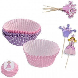 Papierové koláčiky s potlačou princeznej a ozdobnými drevenými špáradlami - ideálna sada na detskú oslavu, narodeninovú párty, dovolenku atď. Košíky sú vhodné na muffiny, cupcakes a iné rôzne sladkosti, špáradlá napríklad na ovocné občerstvenie. Košíčky sú vhodné aj na pečenie do 180 °C.