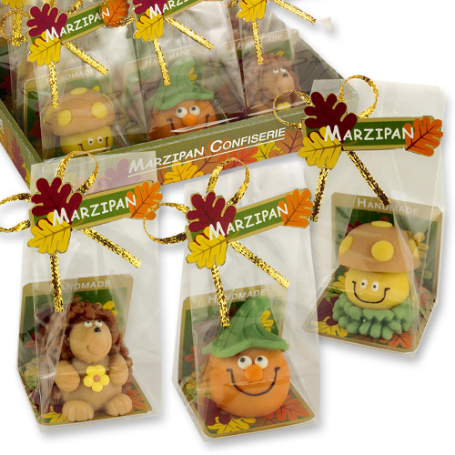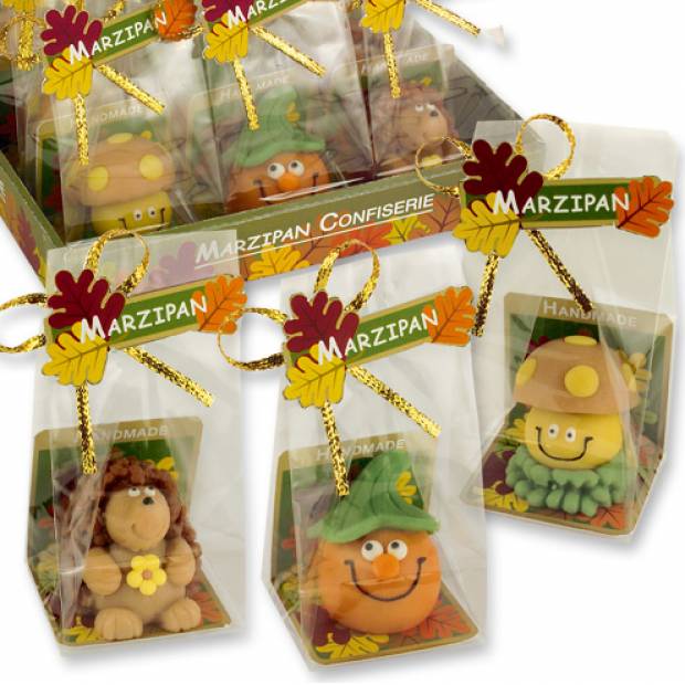 Marcipánové figúrky sú vytvorené ako jesenné motívy. Táto jedlá dekorácia je pekným darčekom pre vašich blízkych. Na výber je niekoľko motívov, každá figúrka je zabalená v celofánovom vrecúšku. Rozmery 38 x 40 x 45 mm ( 32 g).